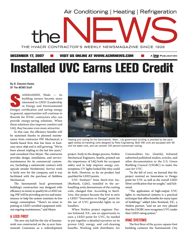 Ce nouveau projet de construction du gouvernement de la ville a été le premier à obtenir des points LEED «Innovation en conception» pour l'utilisation de lampes germicides UVC dans les appareils de traitement de l'air.